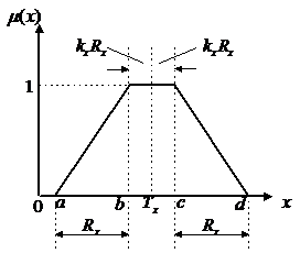 本文主要討論bc兩點(diǎn)重合的情況,即圖7.2(b)所示的情況,此時(shí)可選取模糊變量隸屬函數(shù)的兩參數(shù)為:中心值和模糊幅度,其幾何意義已在圖7.2(b)中標(biāo)示出。則隸屬函數(shù)可寫成下面的形式
